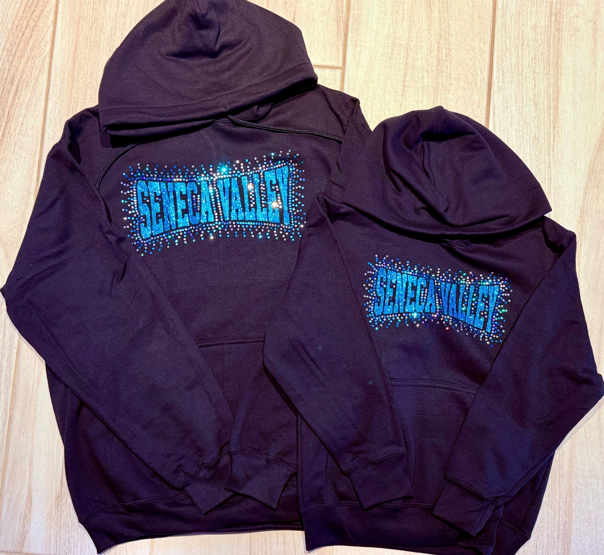 Show your Seneca Valley pride in this black hoodie featuring blue and silver glitter + spangle details āØ